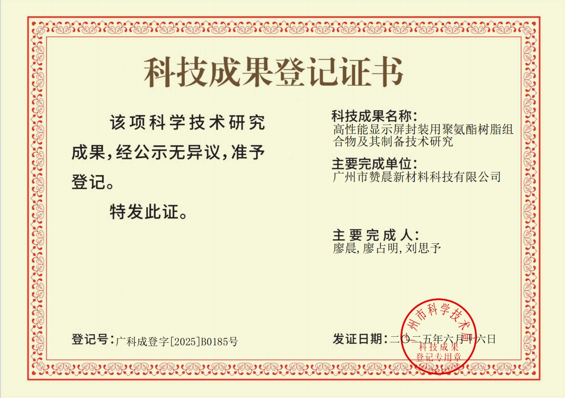 廣州市贊晨新材料科技有限公司高性能顯示屏封裝用聚氨酯樹脂組合物及其制備技術(shù)獲國(guó)內(nèi)領(lǐng)先鑒定?